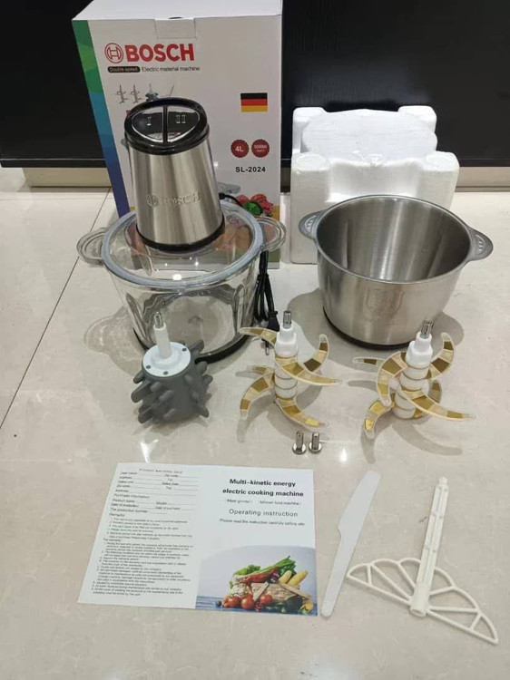 خردکن بوش 3000وات دارای دو مخزن 3.5 لیتر یک عدد کاسه شیشه ای و یک عدد کاسه استیل دارای دو دست تیغ شیش تیغ مناسب برای خرد کردن میوه سبزیجات سالاد غذای کودک و خرد کردن گوشت و مرغ و..